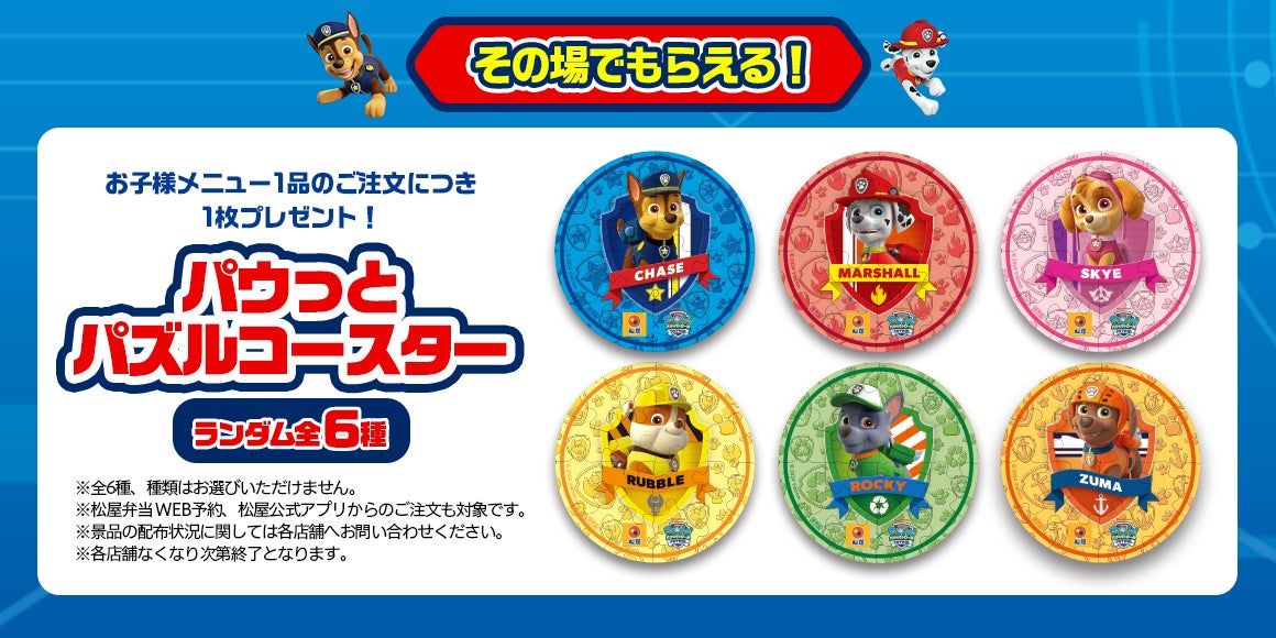 全国の松屋にて、お子様メニューご注文で「パウっとパズルコースター」がその場でもらえる!X公式アカウントをフォローと対象の投稿をリポストしてパウ・パトロールグッズも当たる!