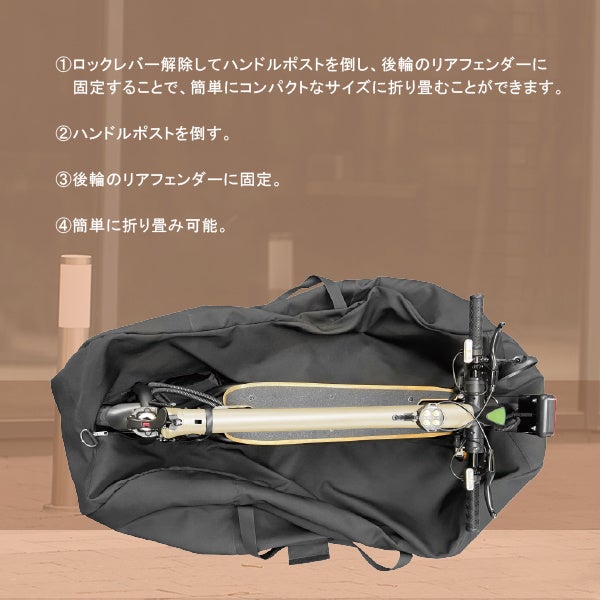 折りたたむことでコンパクトサイズになり、ロックレバーを解除しハンドルポストを倒し、後輪のリアフェンダーに固定することで簡単に持ち運び可能なサイズに変わります。これにより、車にも積み込みやすく、車両を使わずに電車での移動も可能です。移動先での乗り換えが容易で、レジャーや観光など幅広い用途に対応します。