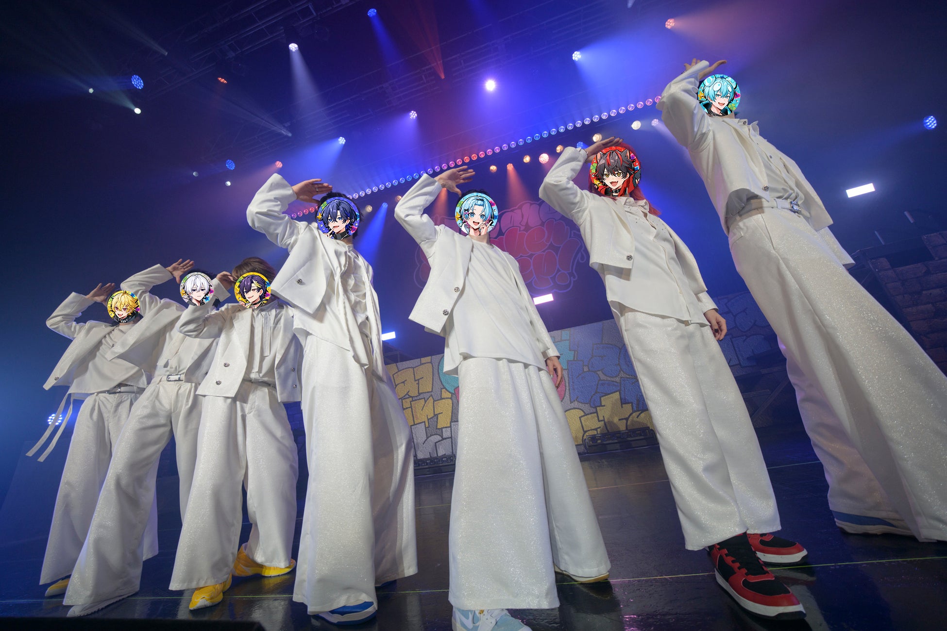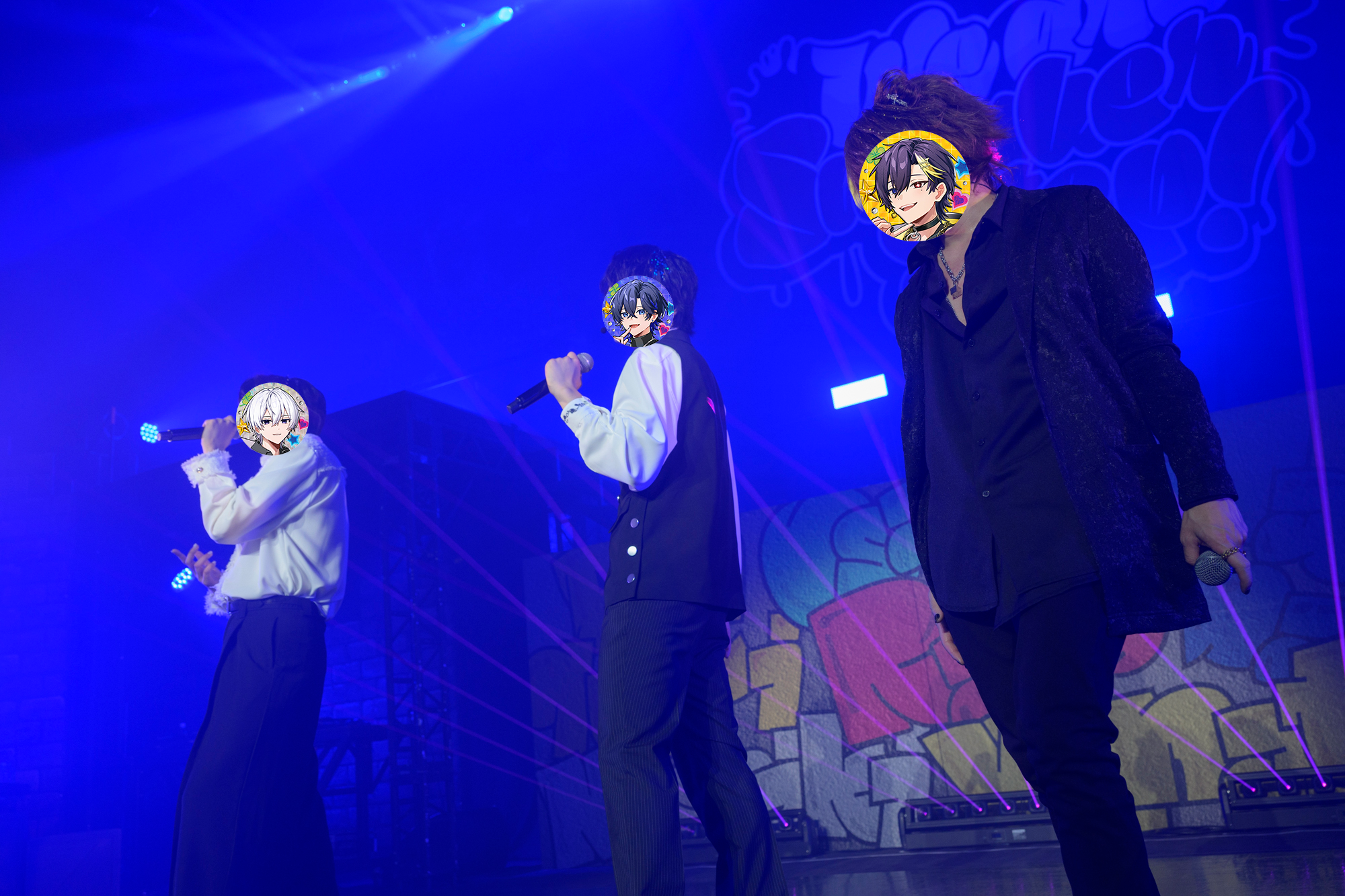 にしき、だいきり、たちばなの3名によるユニット『COOL組』がステージ上段に登場。「MΞLLOW FΞLLOW」は、3人のイケボを活かしたセクシーな曲。セリフ、ハーモニーやユニゾン、モノトーン衣装にぴったりのセクシーなコレオ、手を差し伸べるようなしぐさ…と次々に繰り出されるパフォーマンスは、アダルトな魅力が満載だ。「III」(原曲:hololive/宝鐘マリン&こぼ・かなえる)のカバーも披露。大人っぽい歌声と、クールなパフォーマンスで盛り上げた。