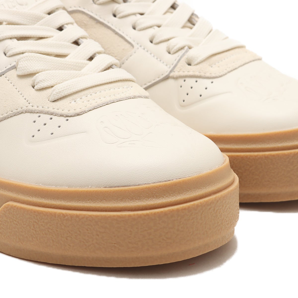 今回のデザインのポイントとして、アッパーの素材にはスエードとレザーがMIXで使用されていたり、フォームストライプの刺繍がぷっくりとした仕上がりとなっています。atmos pinkロゴも大きく刻まれていて、どこから見ても楽しめる一足。