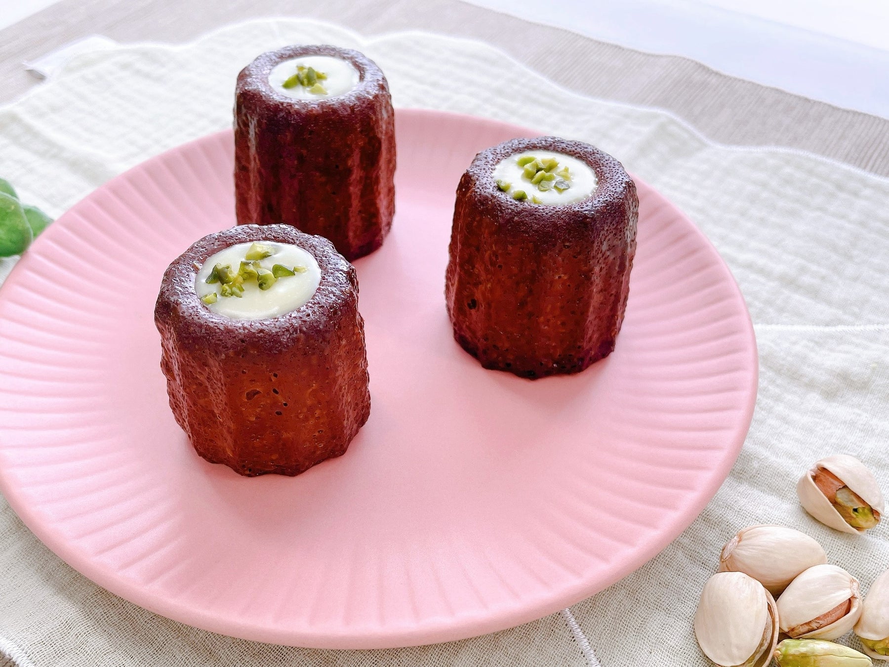 ピスタチオの優しい甘さのカヌレ生地に、ピスタチオ風味のチョコクリームと、砕いたピスタチオをトッピングしました。ピスタチオの濃厚なコクと風味を楽しんで頂けるカヌレです。