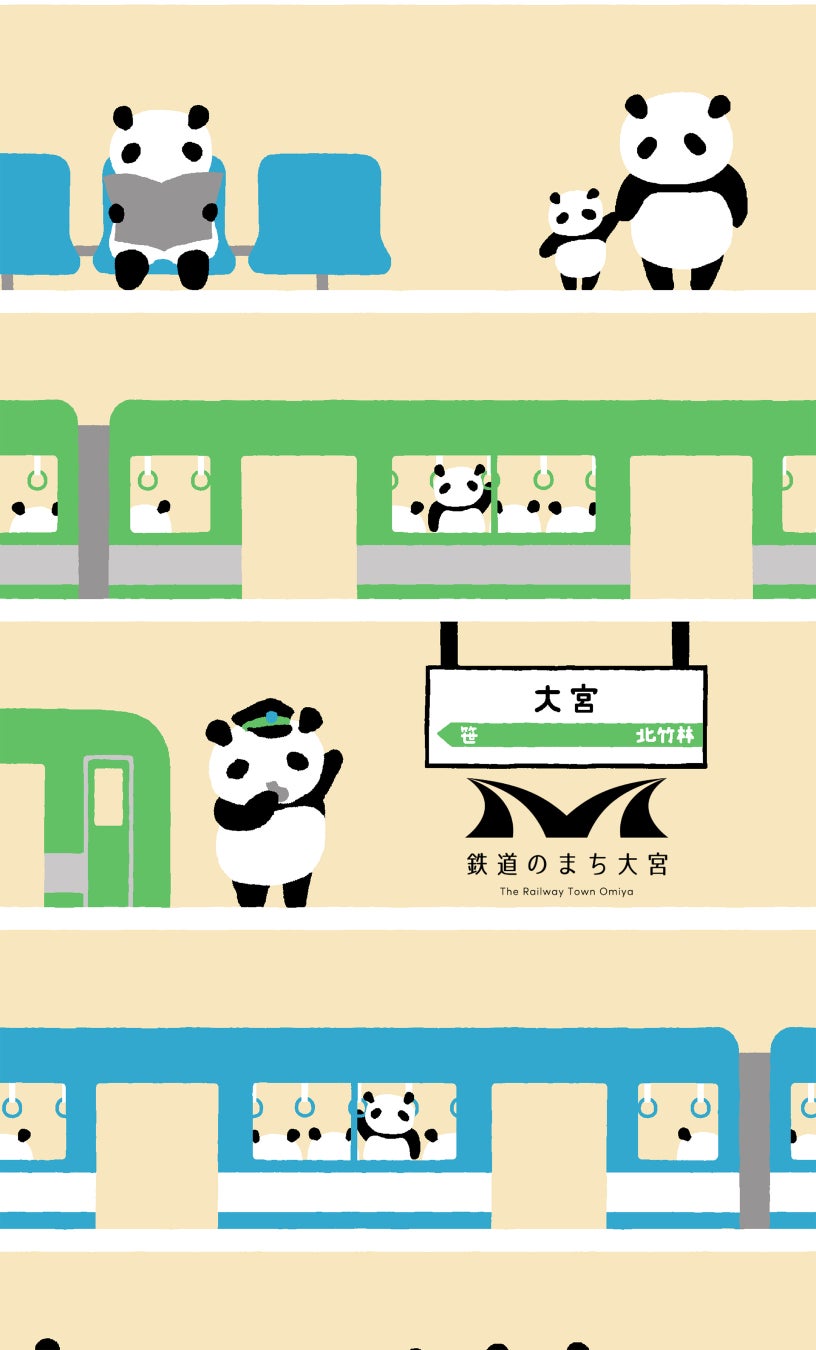 パンダが鉄道の駅を使う風景を描いた絵手ぬぐい。「鉄道のまち大宮」ロゴも使用し、大宮ならではの風景をモチーフにしました。通勤や旅行、日々の移動といった風景をパンダが可愛らしく表現しています。