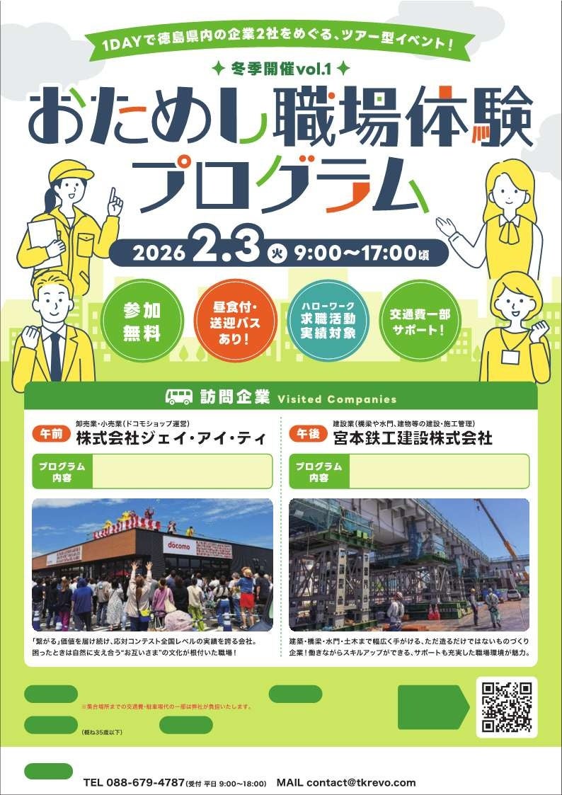 1DAYで徳島県内の企業2社をめぐり、現場を体感できる「おためし職場体験プログラム」を開催します!
