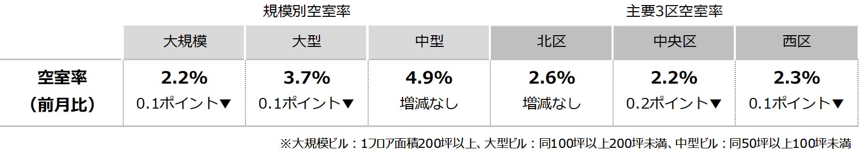 空室率は前月比マイナス0.10ポイントの2.24%で、5ヵ月連続の低下となった。主要エリアの新築・築浅ビルを中心に空室の消化が進み、主な低下要因となっている。潜在空室率は前月比マイナス0.17ポイントの3.90%となり、2021年2月以来の3%台に低下している。