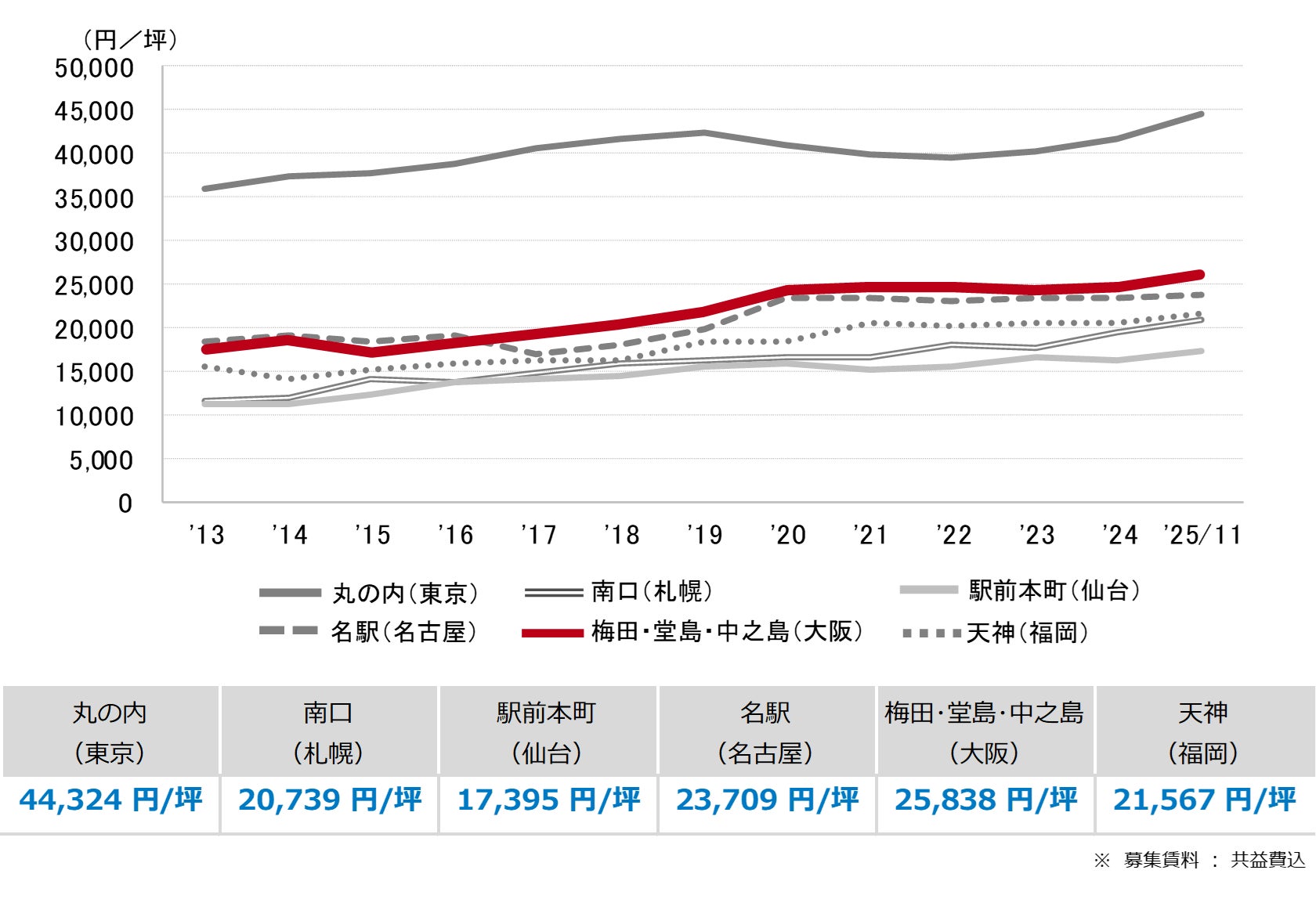 三幸エステート株式会社(本社:東京都中央区、取締役社長:福島正二郎)は、2025年11月度の大阪市オフィス賃貸状況(空室率&現空面積:大規模、募集賃料&募集面積:大規模、規模別空室率、主要3区※1空室率:大規模)および全国6大都市(東京・札幌・仙台・名古屋・大阪・福岡)の大規模ビルのマーケットデータをまとめた「オフィスマーケット2025年12月号大阪」を公表します。