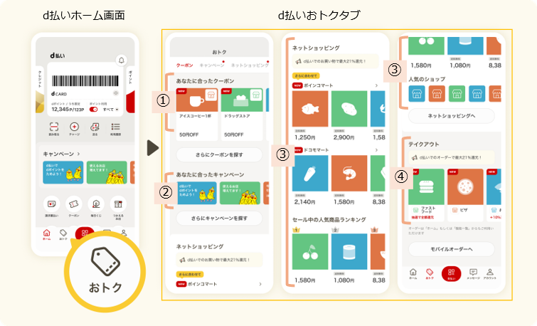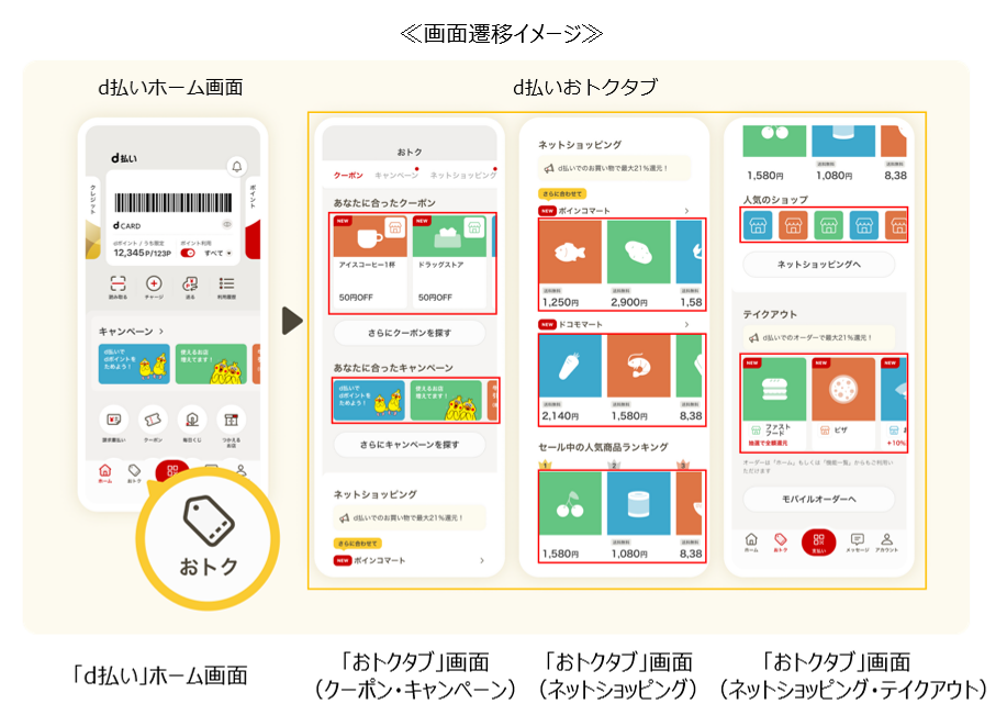 「d払い®」アプリ内に新設する「おトクタブ」では、「d払い」アプリ内で利用できるクーポン、キャンペーン、ネットショッピング、テイクアウトに関する情報を見ることができることに加え、お客さまの利用状況に応じて(※4)おすすめのおトクな情報を表示します。これにより、日々のお店のお買い物や、セール中のネットショッピング商品などおトクな情報を、より便利に、かつ見逃すことなくご利用いただけます。「おトクタブ」の詳細は別紙をご確認ください。