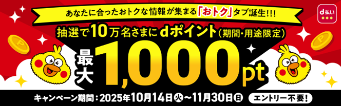 株式会社NTTドコモ(以下、ドコモ)は、2025年10月14日(火)に「d払い®」アプリ内に、お客さまに合わせてクーポンやキャンペーンなどのおトクな情報を表示する「おトクタブ」の新設(※1)(※2)を記念して、「d払い『おトクタブ』誕生記念!ワンタップで最大1,000ポイントプレゼントキャンペーン」(以下、本キャンペーン)を、2025年10月14日(火)から2025年11月30日(日)まで開催いたします(※3)。