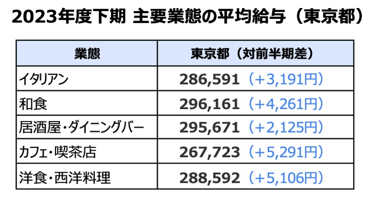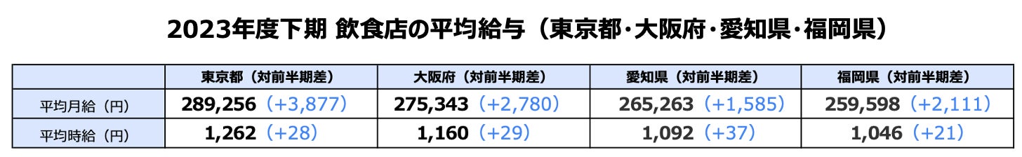 ※参考:【2023年度上期飲食店動向】飲食店の平均給与(業態・業種別)を飲食店ドットコムが発表。東京28.5万、大阪27.3万、愛知26.4万、福岡25.7万