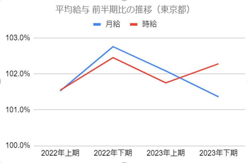 平均時給については、東京都は2023年度上期から28円上昇して1,262円(前半期比102.3%)、大阪府では同比+29円で1,160円(前半期比102.6%)。愛知県では同比+37円の1,092円(前半期比103.5%)、福岡県では同比+21円の1,046円(前半期比102.0%)という結果となりました。