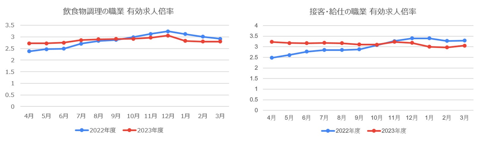飲食関連職種の有効求人倍率は、依然として高い数値ではありますが、2023年度下期から前年を下回って推移しており、コロナ後の求人需要増加速度が落ち着きつつあることも、背景として考えられます。