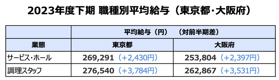 職種別平均給与額では、2023年度上期と変わらず、東京都・大阪府ともにサービス・ホールよりも調理スタッフの給与額が高い結果となりました。