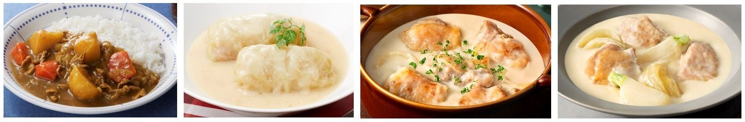 左から<カレーに>、<クリームソースに>、<ガーリックを加えて「シュクメルリ」に>、<ローレルやセロリを加えて「香味シチュー」に>
