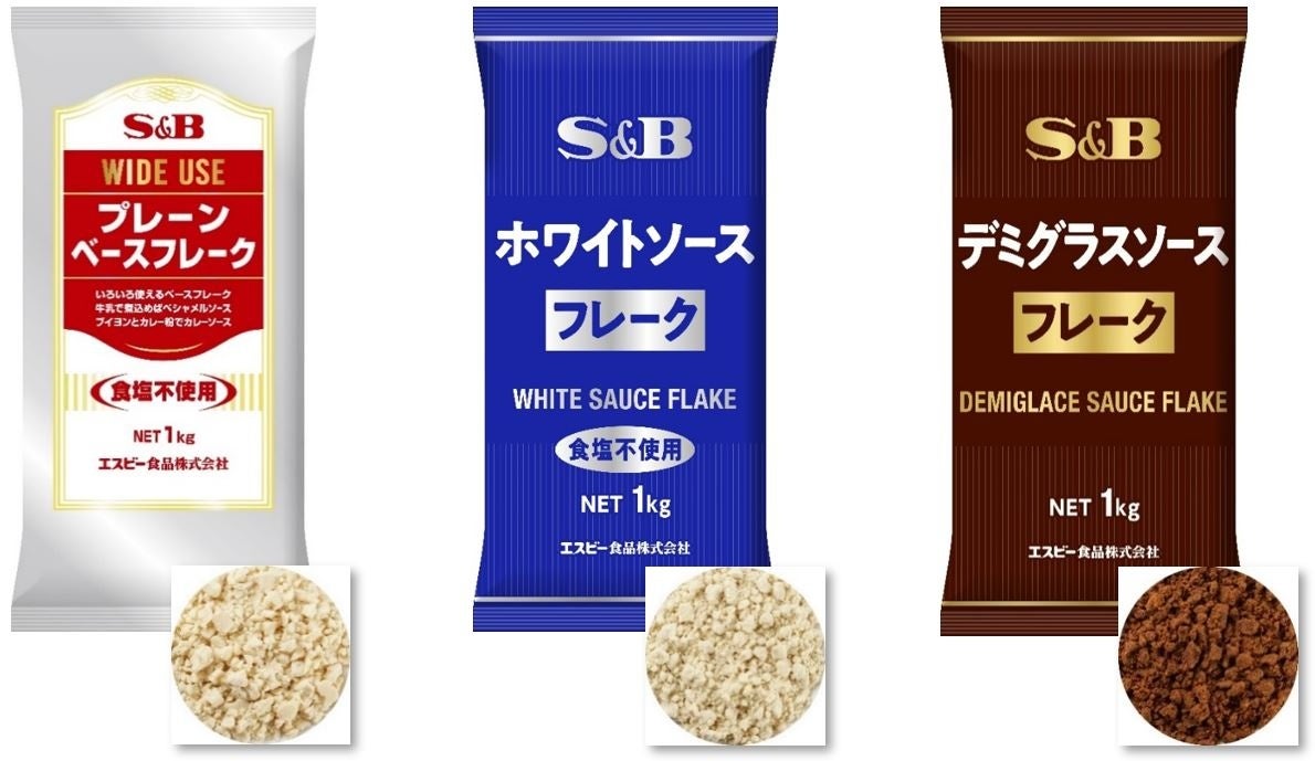 プロユースの新ソース用フレーク3品 さまざまな料理にアレンジ無限大 業務用「プレーンベースフレーク」「ホワイトソースフレーク」「デミグラスソースフレーク」2月27日 新発売