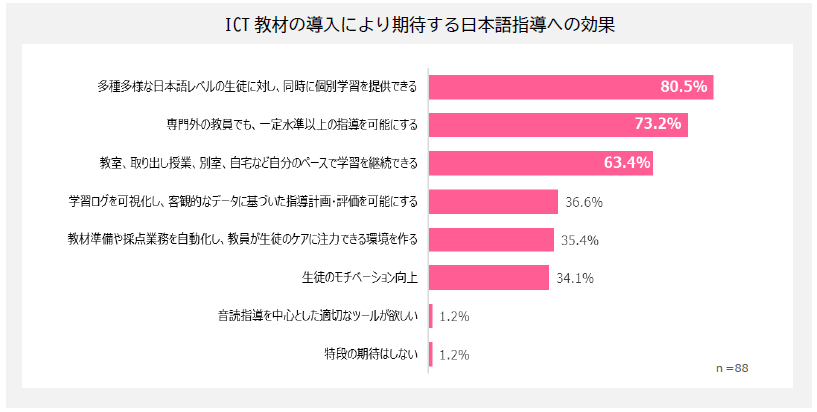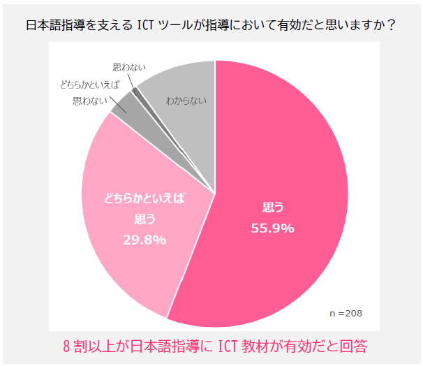 さらに、日本語指導においてICT教材が有効と考える回答は、全体で8割を超えました。なかでも教育委員会・管理職に限ると9割を超えており、現場だけでなく行政側においても導入の必要性が強く認識されていることが明らかになりました。