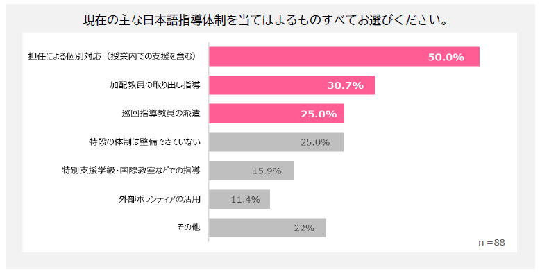 今回の調査では、教育委員会・管理職の56.1%が「日本語指導が必要な児童生徒が増加・急増している」と回答している一方で、主な対応は「担任による授業内での個別対応」(50.0%)に依存しており、依然として教員のマンパワーに頼った運用が続いています。増加するニーズに対して、従来の体制のままでは持続的な対応が難しくなりつつあります。