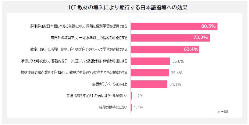 ICTには、母国語で意味を確認しながら学べる機能や、AIによる理解度に応じた個別最適な学習、場所を問わず継続できる学習環境の提供などが期待されており、従来の一斉指導では対応が難しい課題を補完する手段として、その重要性が高まっています。