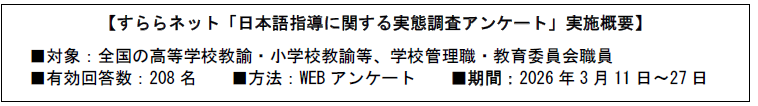 AIを活用したアダプティブな対話式 ICT 教材の開発と提供を行う株式会社すららネット(本社:東京都千代田区、代表取締役:湯野川孝彦)は、国内の教育現場における日本語指導の実態に関する調査を実施しました。その結果、日本語指導の多くが担任教員に委ねられている一方で、専門的な研修機会が十分に確保されていない実態が明らかになりました。こうした状況を背景に、ICT教材の活用を必要とする声が全体の8割以上にのぼり、日本語指導におけるICTの重要性が強く認識されていることが分かりました。