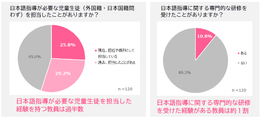 本調査は、全国の教員および教育委員会・管理職208名を対象に実施しました。日本語指導が必要な児童生徒を担当した経験を持つ教員は過半数にのぼる一方で、専門的な研修を受けた経験がある教員は約1割にとどまり、十分な知識や支援体制が整わないまま対応を担っている実態が浮き彫りとなりました。