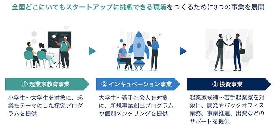 ガイアックスのスタートアップスタジオでは「全国どこにいてもスタートアップスタジオに挑戦できる環境」をつくるために、産学官で連携しながら、①起業家教育事業、②インキュベーション事業、そして③投資事業の3つの事業を提供しています。
