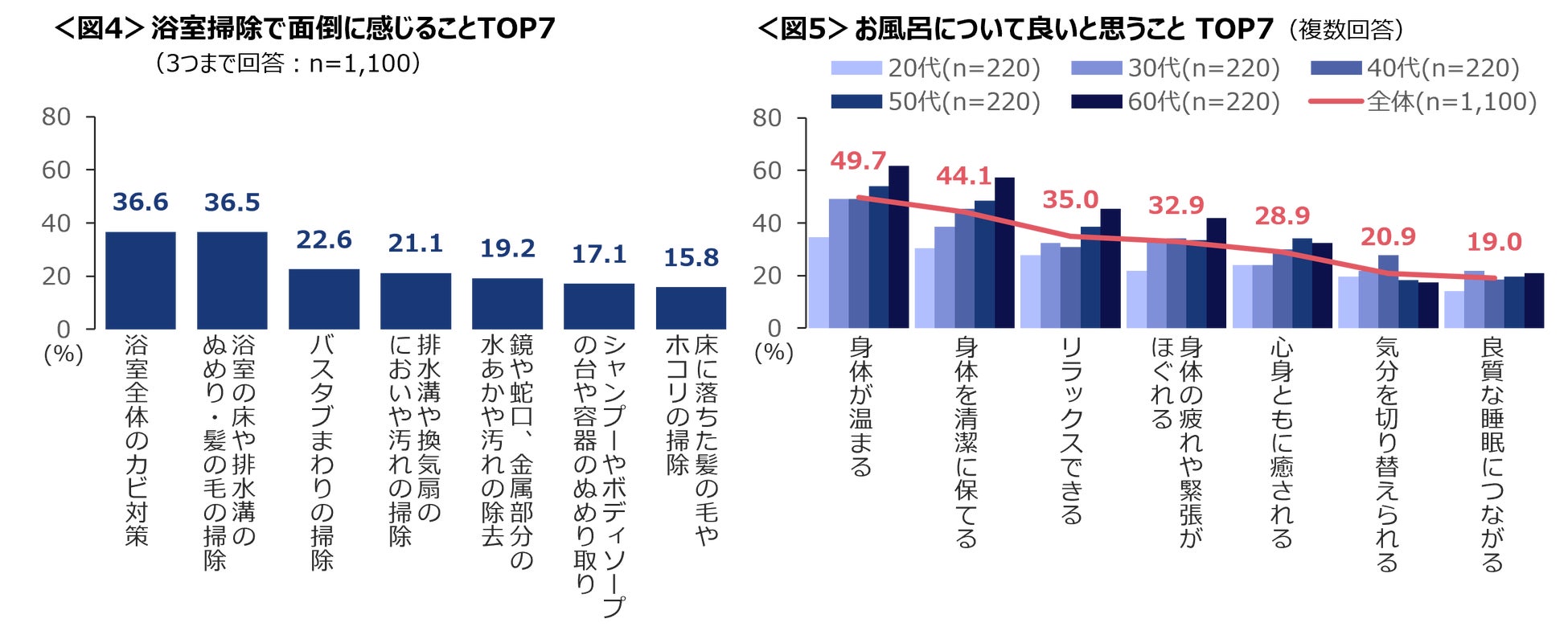 浴室掃除で面倒に感じることは、「浴室全体のカビ対策」「浴室の床や排水溝のぬめり・髪の毛の掃除」がTOP2。<図4>