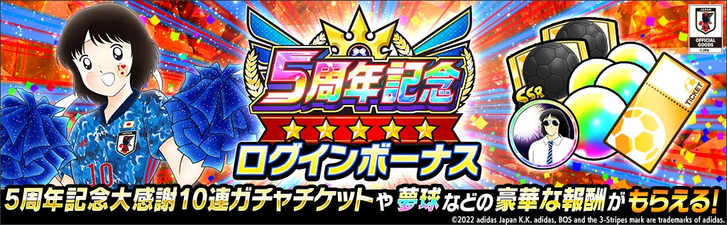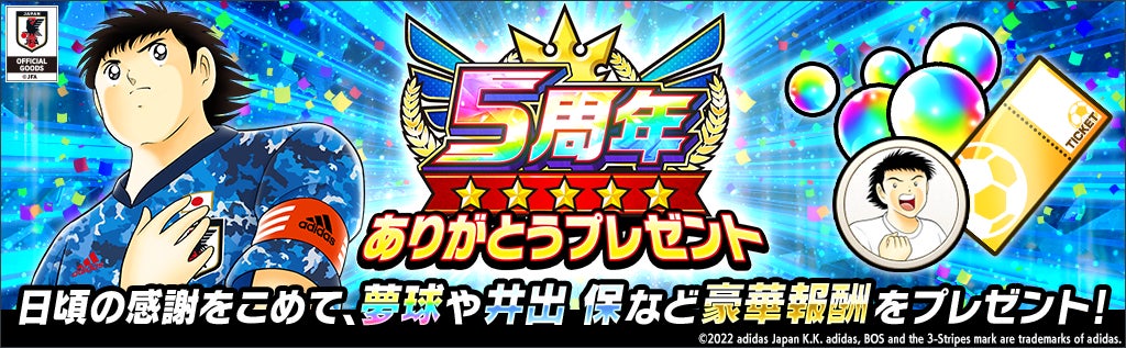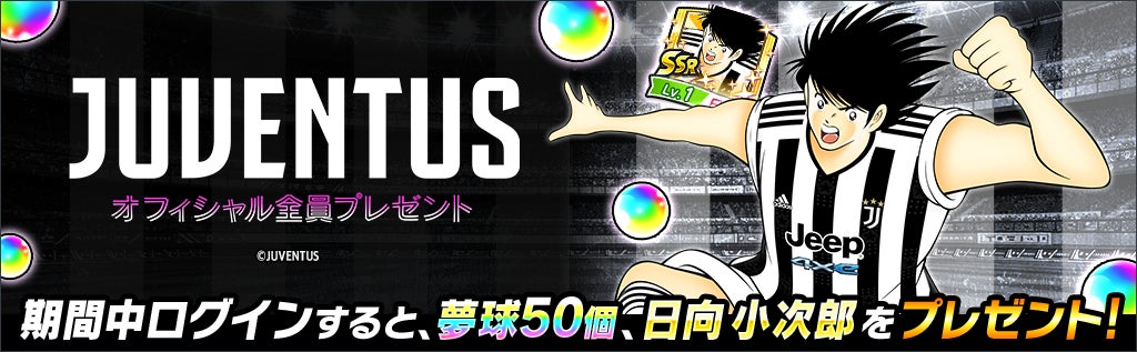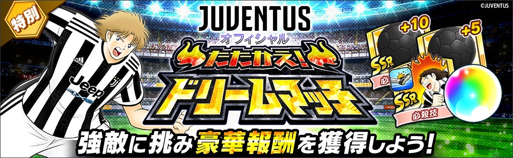 KLab株式会社(本社:東京都港区、代表取締役社長:森田英克、以下「KLab」)が提供するスマートフォン向け対戦型サッカーシミュレーションゲーム『キャプテン翼 ~たたかえドリームチーム~』では、6月3日(金)よりリリース5周年記念として「JUVENTUSオフィシャル 全員プレゼント」などのキャンペーンを開催しております。