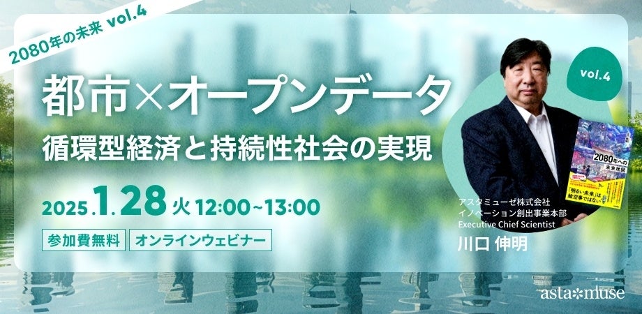 アスタミューゼ株式会社(本社:東京都千代田区、代表取締役社長 永井歩)は、2025年1月28日(火)12:00-13:00に、『2060 未来創造の白地図』および『2080年への未来地図』著者、弊社のExecutive Chief Scientistである川口伸明による無料ウェビナー「都市xオープンデータ:循環型経済と持続性社会の実現 ~2080年の未来シリーズvol.4~」を開催いたします。書籍に取り上げた技術領域や社会課題、未来世界について語るウェビナーです。