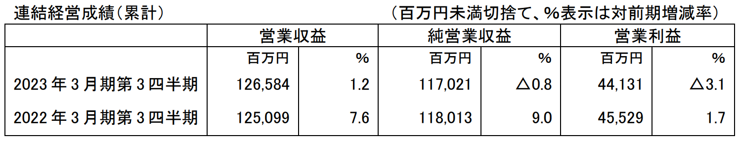 株式会社SBI証券(本社:東京都港区、代表取締役社長:髙村正人、以下「当社」)の2023年3月期第3四半期連結業績(日本基準)は以下のとおりとなりましたのでお知らせいたします。