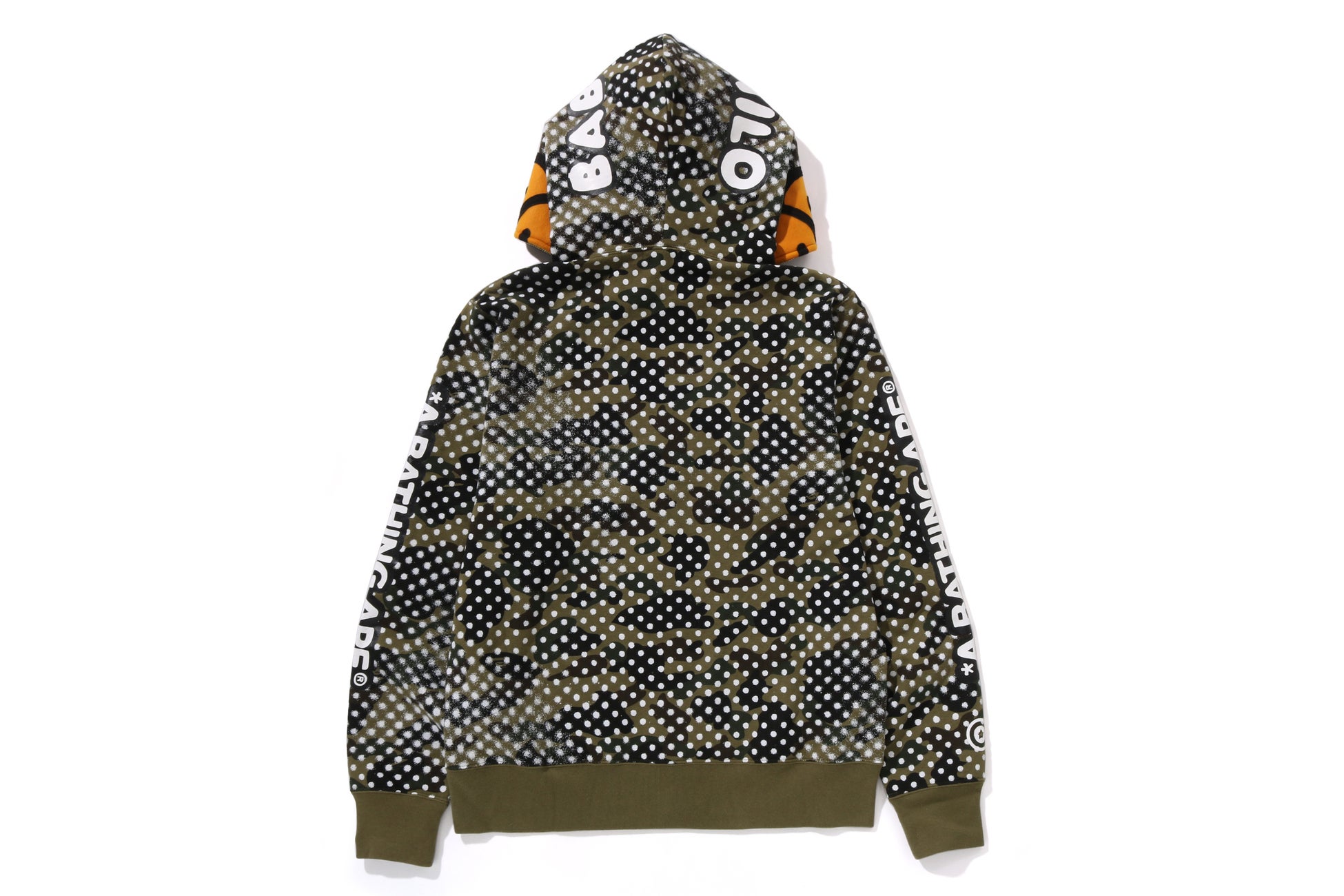 “MILO FACE”タイプのフルジップフーディーは、BAPE® CAMOの上から、ヴィーダスがドットを描きました。さらに、“A BATHING APE®”や“BABY MILO®”のロゴを縁取りしてクラフト感を演出しています。