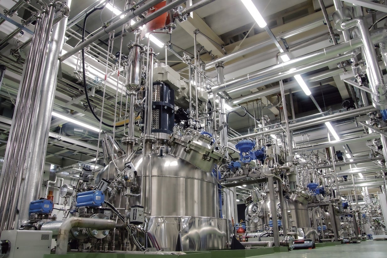 右上: Spiber本社に隣接する発酵プロセスのパイロットプラント
