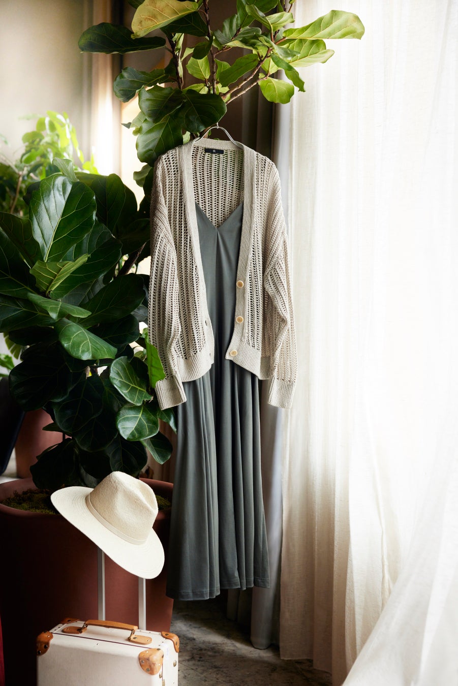 テンセル素材を使用したキャミドレスは、柔らかな肌ざわりでストレスフリーな着心地を実現。エアコンや日焼け対策にもなる透かし編みのカーディガンがあれば、洗練されたコーディネートに昇華。