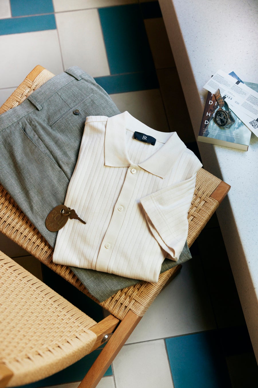 コットン×モダール素材のソフトな肌ざわりが魅力のリブ リゾートシャツ。イタリア製の生地で仕立てられたドレスパンツを合わせてエレガントな装いに。ホテルでのあらゆるシーンで特別な時間を過ごせます。