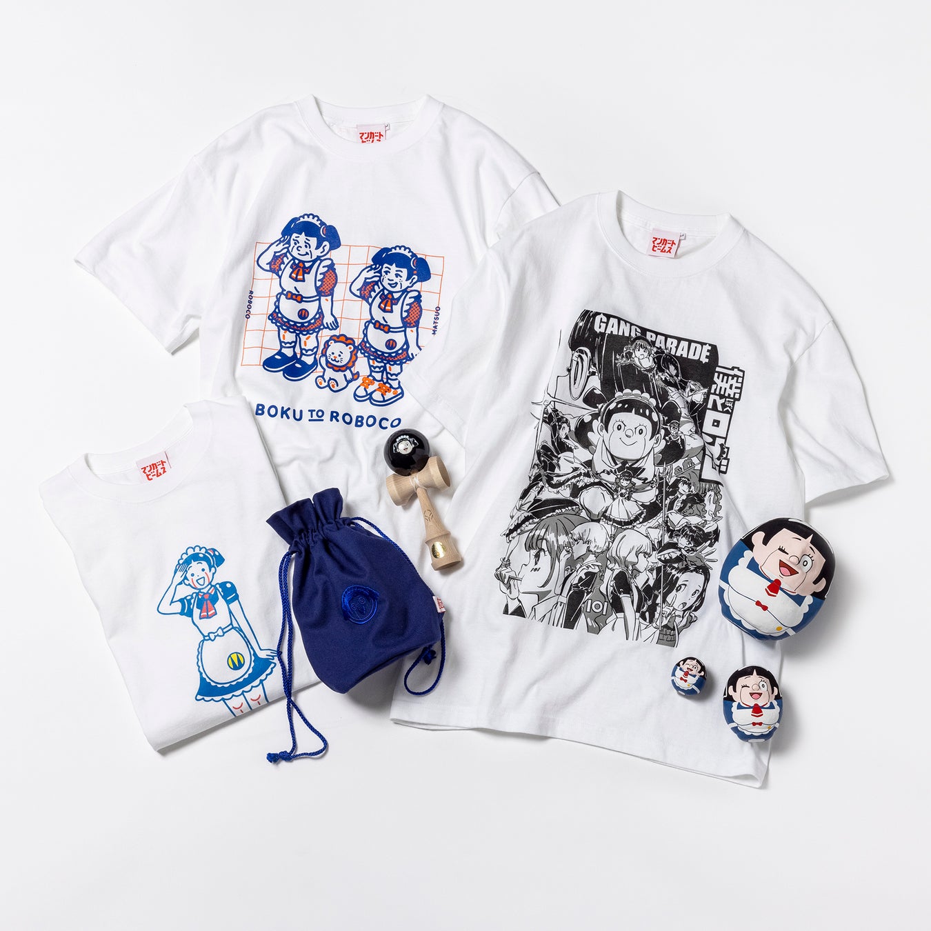 コラボレーションTシャツ3型にはイラストレーター白根ゆたんぽ氏、すしお氏、docco氏の3名が本企画の為に書き下ろした、TVアニメ『僕とロボコ』のテーマソングを歌うアイドルグループ『GANG PARADE』とロボコをイラストに落とし込んだデザインや、本作品で声優としてロボコ役を演じている『チョコレートプラネット』松尾駿氏とロボコとニョンタを描いたTシャツの他に、けん玉、だるま、巾着バックなど日本の伝統的なアイテムにロボコの要素を加えたコラボアイテムが揃います。