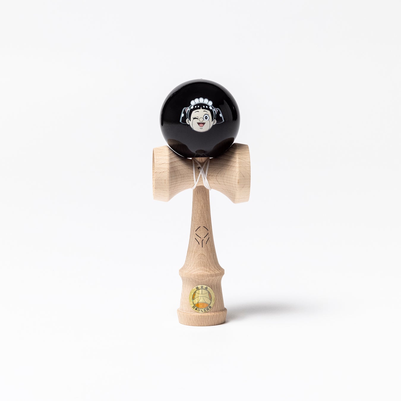 自然の恵みや木目の美しさを活かした、〈山形工房〉の別注けん玉。玉部分にロボコの顔とサイン、けん軸は膝仕様に。