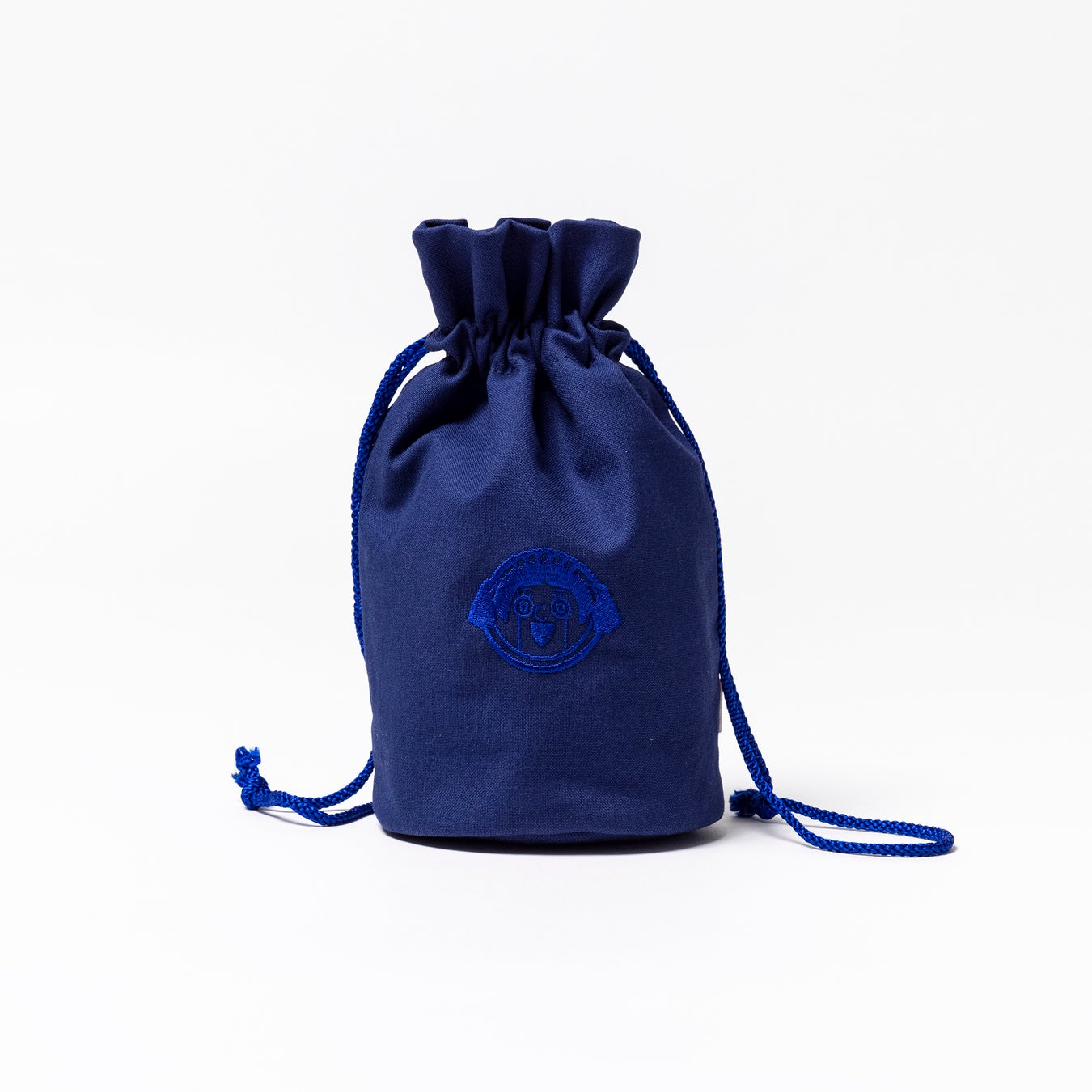 けん玉のはいるサイズの巾着バック。ロボコの家紋風イラストが刺繍で入っています。