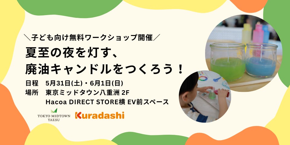 ソーシャルグッドマーケット「Kuradashi」を運営する株式会社クラダシ(本社:東京都品川区、代表取締役社長CEO:河村晃平、以下「クラダシ」)は、5月31日と6月1日に東京ミッドタウン八重洲にて廃油キャンドルをつくるワークショップを開催いたします。ワークショップでは東京ミッドタウン八重洲2F ヤエスパブリック内の飲食店にて発生する廃油の活用を予定しております。