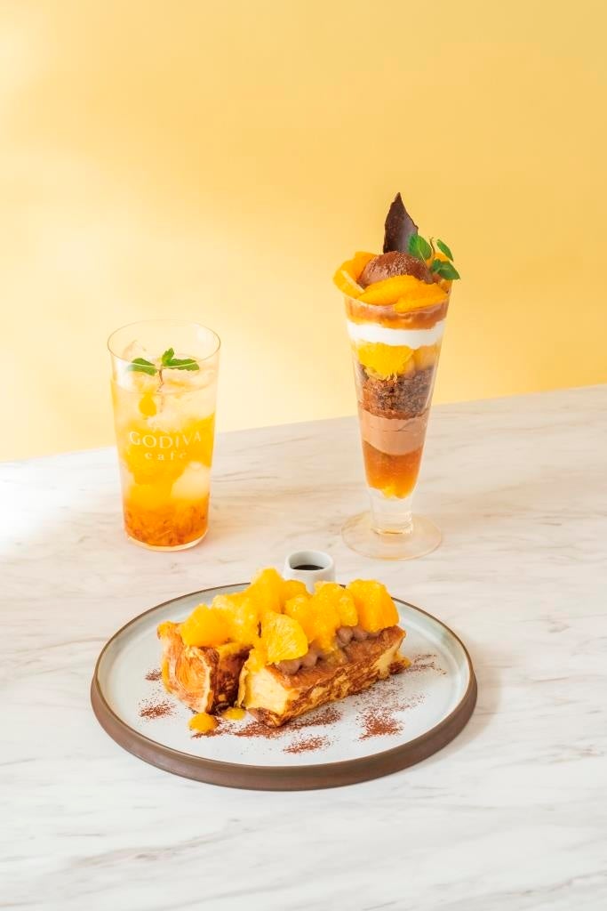 3月から新登場するメニューは、チョコレートと甘夏・デコポン・伊予柑などの柑橘を使用した2種類のデザートとドリンク、「甘夏とデコポンのフレンチトースト」と「甘夏とデコポンのチョコレートパフェ」、「甘夏と伊予柑のカカオフルーツソーダ」と、甘酸っぱく瑞々しい苺をGODIVAのチョコレートでコーティングした「チョコレートストロベリー ダーク」、「チョコレートストロベリー ホワイト」、そしてカカオとチョコレートの魅力を存分に堪能いただける「アフタヌーンティーセット」新メニューです。