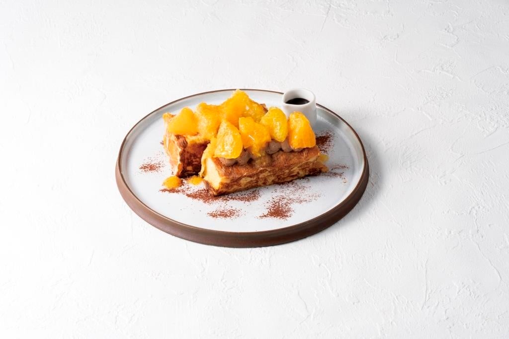 フレンチトーストの上にはオーブンでローストしたデコポンと甘夏をトッピング。ダークチョコレートソースをたっぷりかけてお召し上がりください。