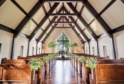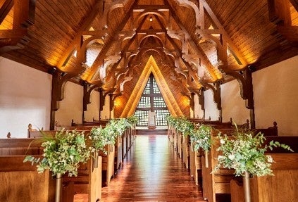 森の小路にひっそりと構える、三角屋根の「森音の教会」。草木や花の匂いなど、心が洗われるような美しい景色が皆さまをお迎えいたします。木のあたたかな風合いを生かした印象的な装飾のもと、人前式・キリスト式を執り行うことが可能です。