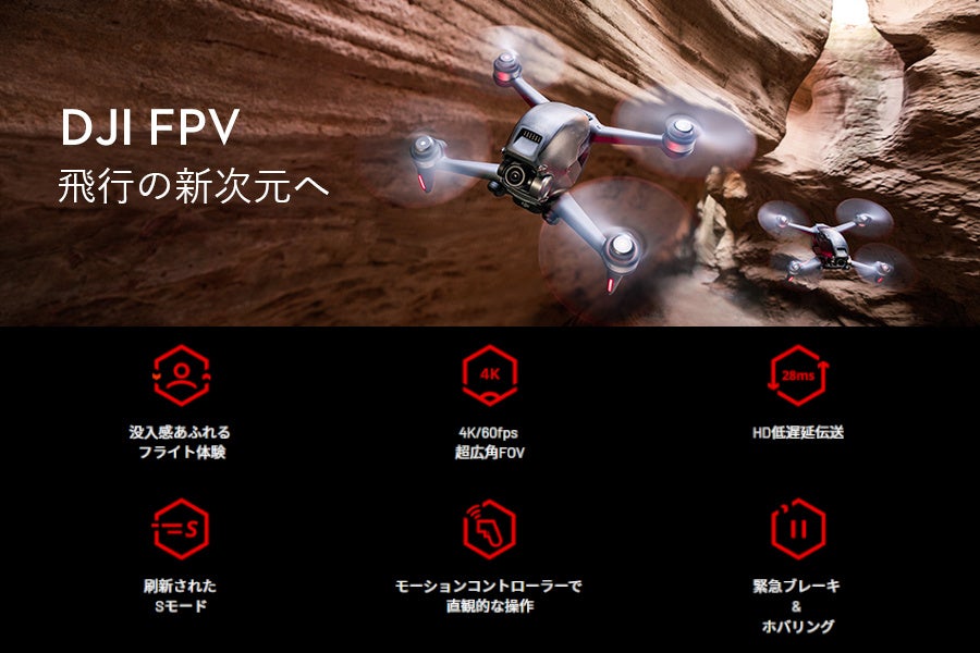 DJI FPV は、専用ゴーグルを装着してドローンに乗っているようなフライト体験ができる、新次元のFPV(First Person View[一人称視点])ドローンです。