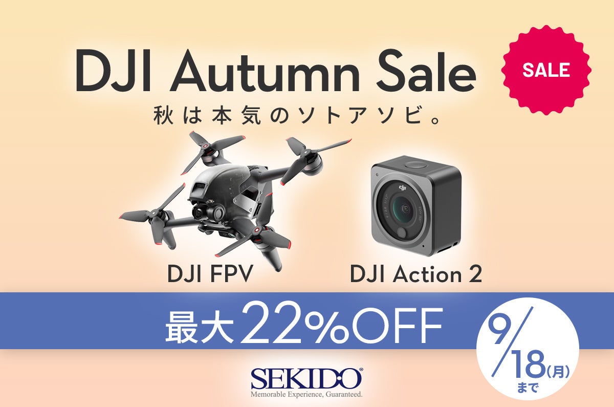 圧倒的なスピードと直感的で自由なフライト、抜群の空撮性能を兼ね備えた「DJI FPV」が10%OFF、場所を選ばず設置してブレない動画が撮影できる根強い人気のアクションカメラ「DJI ACTION 2」は最大22%OFFとなる期間限定セールです。セキドだけのお得なオリジナルセットも対象で、DJIの圧倒的映像体験を手軽に満喫するチャンスです。これから迎える秋の行楽シーズンを映像で記録するのにぴったりのアイテムがお買い求めやすくなっています。