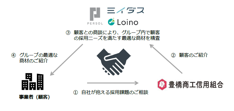 本業務提携は、パーソルグループのミイダス株式会社(本社:東京都渋谷区、代表取締役社長:後藤 喜悦、以下ミイダス)が運営する中途採用サービス「ミイダス」や、パーソルキャリア株式会社(本社:東京都千代田区、代表取締役社長:峯尾 太郎)が運営する地方特化型副業マッチングプラットフォーム「Loino(ロイノ)」を中心としたパーソルグループ各社の人材サービスを、豊橋商工信用組合の顧客企業が抱える経営課題に合わせてご提供するものです。