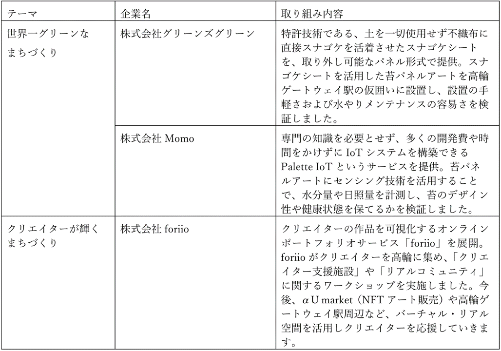 「高輪ゲートウェイStartup Program with JR東日本 × KDDI」の第1期として、「世界一グリーンなまちづくり」と「クリエイターが輝くまちづくり」をテーマに以下の企業を採択し、検証を行いました。今後は新たなテーマでの事業共創案の募集をするなど、スタートアップ企業とのサステナブルな事業共創を推進していきます。