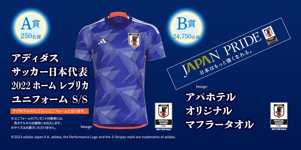 「サムライブルーキャンペーン」は、「アパ直」経由で予約・宿泊、アパアプリで1秒チェックインしたお客様が対象で、1秒チェックイン機から『サムライブルーカードキー』が出たら大当たり!サッカー日本代表グッズ「A賞 アディダス サッカー日本代表2022ホーム レプリカユニフォーム S/S※アパホテルロゴ入り(250名様)」「B賞 アパホテルオリジナルマフラータオル(24,750名様)」を総勢25,000名様にプレゼントします。キャンペーン期間は、2023年10月1日(日)から2023年12月31日(日)までの3か月間、アパホテル全館で毎日開催します。