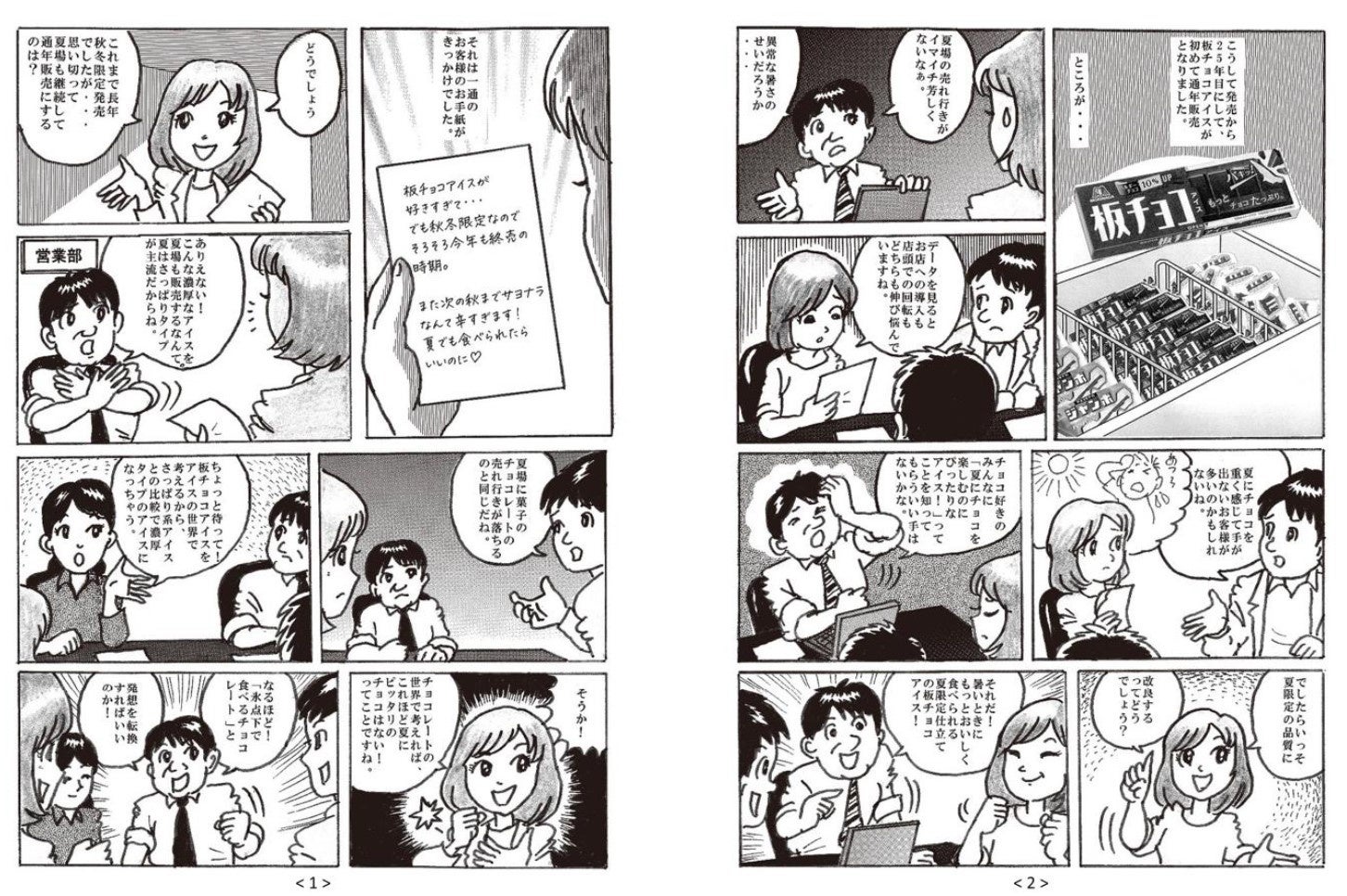 「板チョコアイス<夏限定>」誕生の経緯を漫画でご紹介します。1995年当時に制作された「板チョコアイス」誕生秘話も公開中です。この漫画は30年前に、森永製菓社員によって描かれ、商談資料として利用されていました。今回、当時漫画を描いた社員が、再び漫画を描き下ろしました。