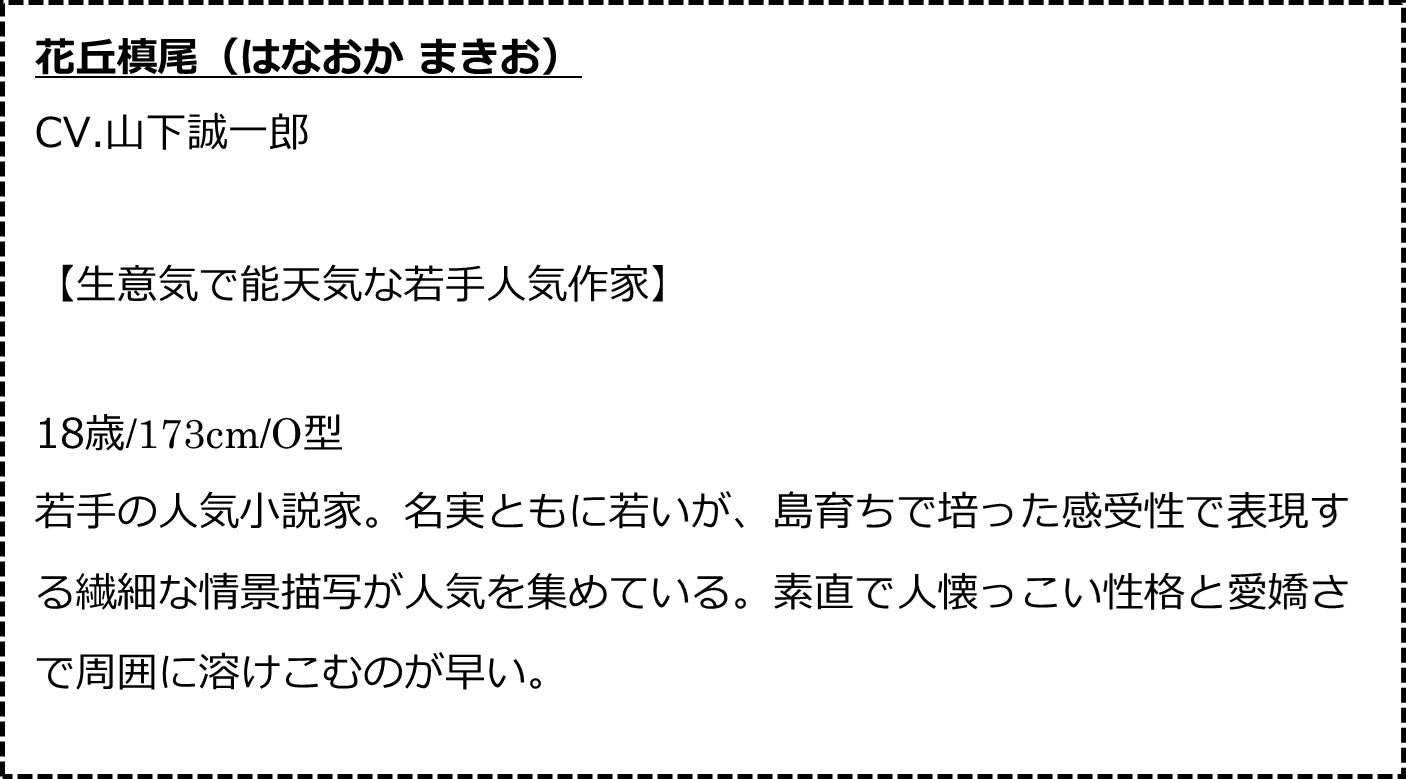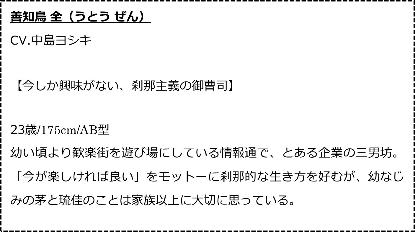 キャスト :花丘槙尾(CV.山下誠一郎)、善知鳥 全(CV.中島ヨシキ)、風見琉佳(CV.伊東健人)、月城 茅(CV.木村良平)