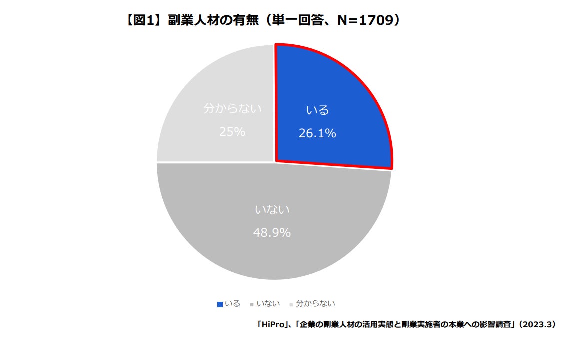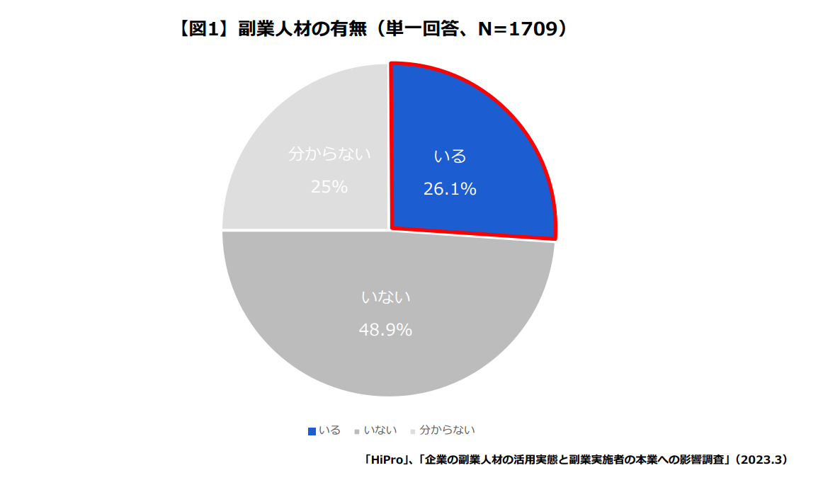 副業を解禁している企業の管理職を対象に、「配下メンバーで副業を行っている人がいるか」を聞いたところ、「いる」と回答した人は26.1%に及び、およそ4人に1人が、副業しているメンバーを抱えていることがわかりました。(【図1】参照)
