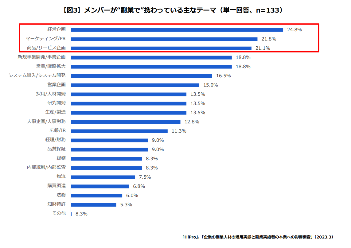 また、本業に良い影響を与えているメンバーの副業内容は、「経営企画(24.8%)」「マーケティング/PR(21.8%)」「商品/サービス企画(21.1%)」が上位に挙がる結果となりました。(【図2】、【図3】参照)