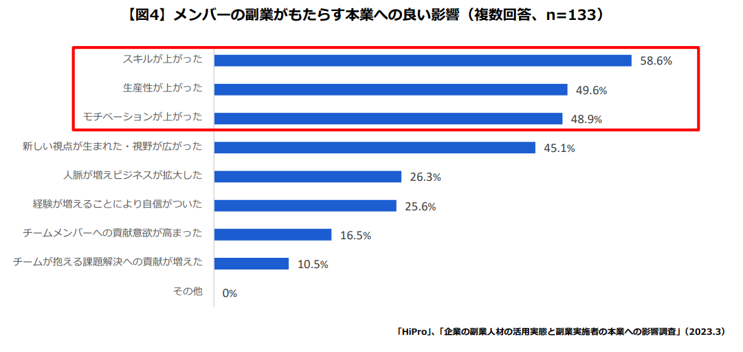 同じく管理職に、「本業への良い影響の具体例」を聞いたところ、「スキルが上がった(58.6%)」「生産性が上がった(49.6%)」「モチベーションが上がった(48.9%)」が上位に挙がりました。(【図4】参照)