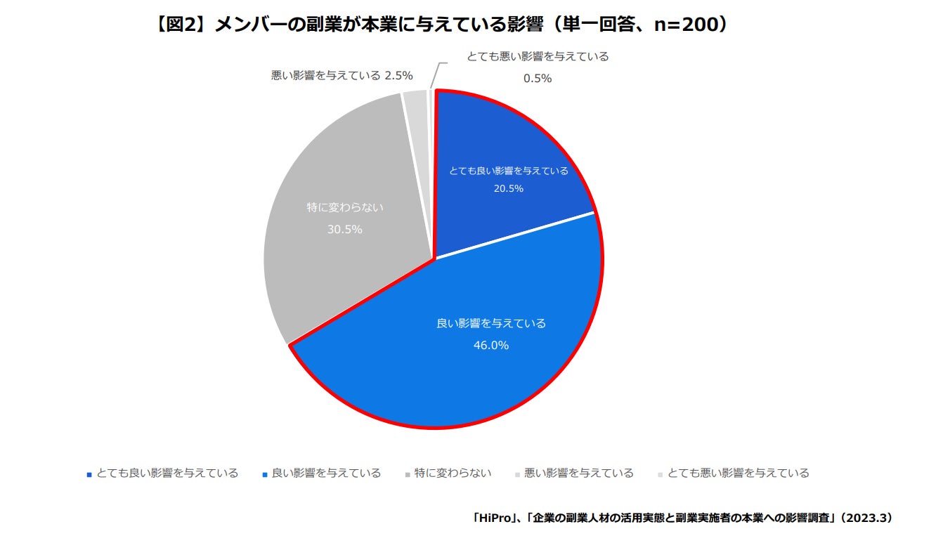 副業を行っているメンバーを抱える管理職に、「メンバーの副業が本業に与えている影響」を聞いたところ、66.5%が「良い影響を与えている」と回答。多くの管理職は副業が本業へ良い効果をもたらすと感じていることが伺えます。