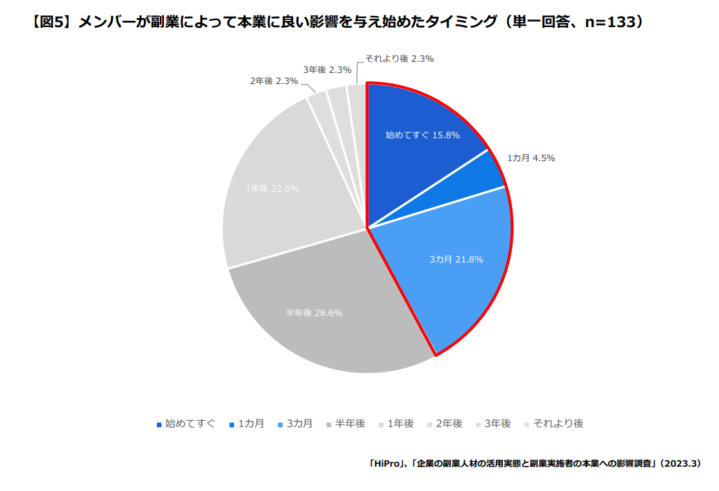 また、「良い影響を感じるようになったのは、メンバーが副業を始めてからどれくらいのタイミングか」を聞いたところ、42.1%が「始めてすぐ~3カ月以内」と回答。早期から本業に良い影響を与え始めていることが明らかになりました。(【図5】参照)